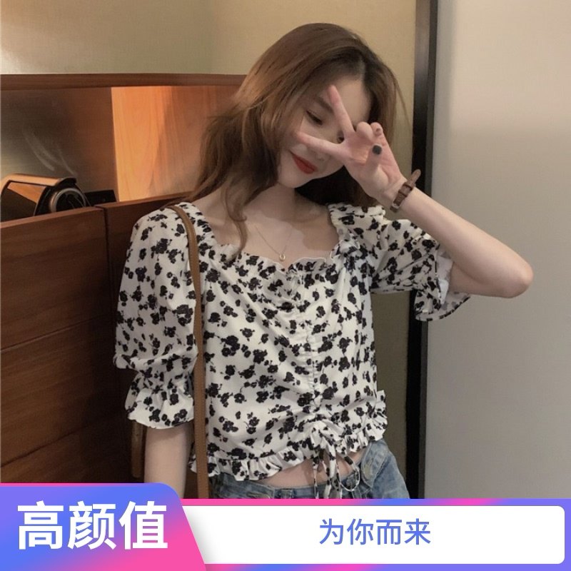 夏季大码胖mm法式复古高腰设计感碎花衬衫泡泡袖短款衬衫抽绳上衣热门设计联盟服务商